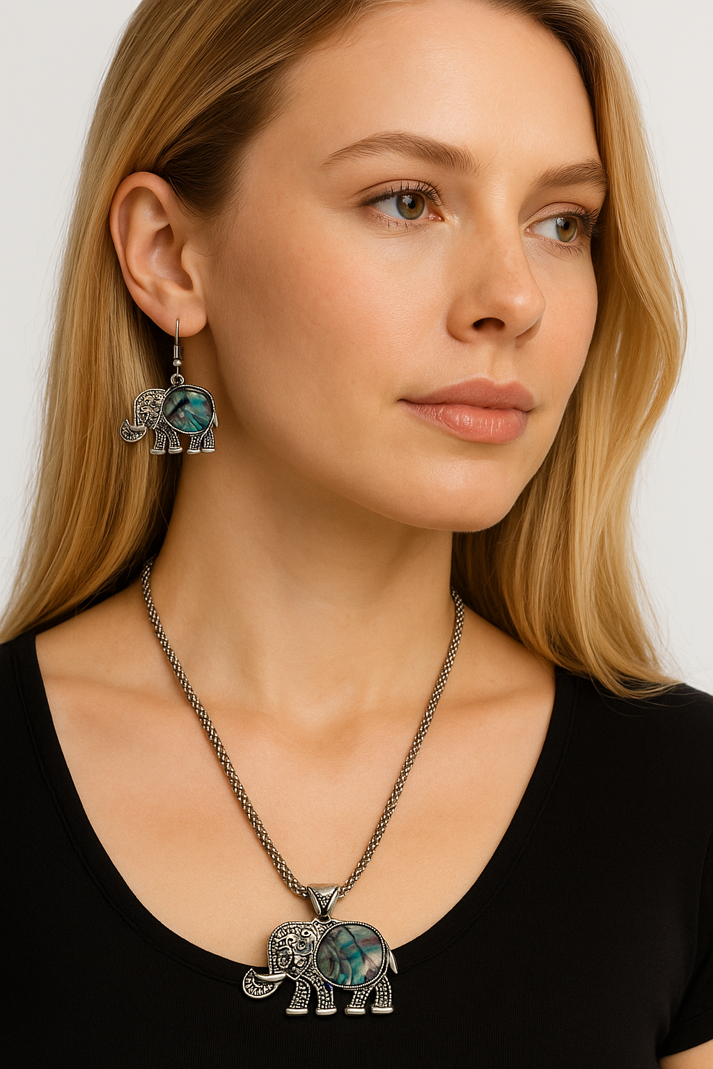 Embellece tu estilo con este encantador set de collar y aretes en forma de elefante, elaborado artesanalmente en la India. Cada pieza combina la resistencia del metal acero con la magia iridiscente de la piedra de concha de abulón, conocida por sus tonos verdes y destellos naturales que recuerdan al océano.