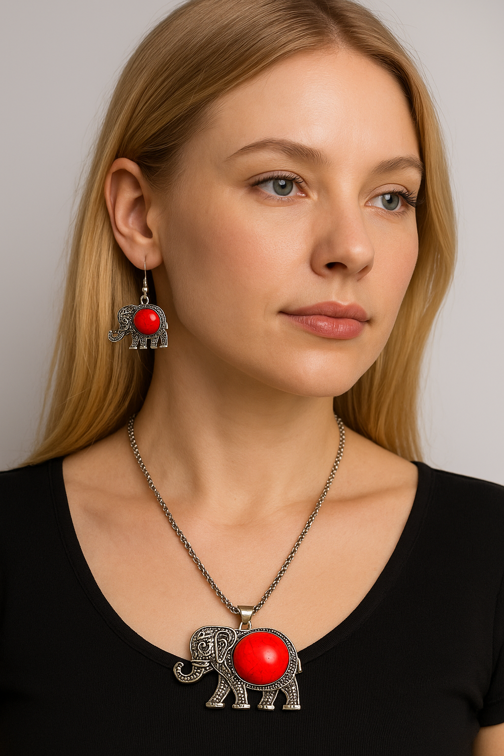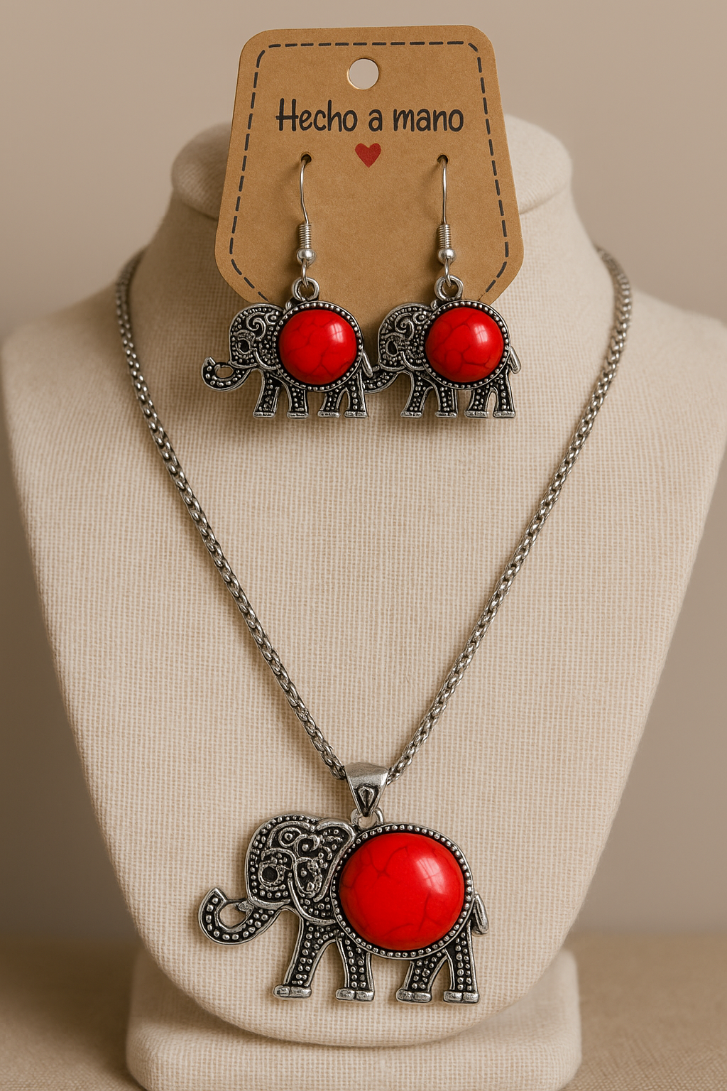 Embellece tu estilo con este encantador set de collar y aretes en forma de elefante, elaborado artesanalmente en la India. Cada pieza combina la resistencia del metal acero con la magia iridiscente de la piedra coral,destacando un diseño llamativo, femenino y lleno de energía.