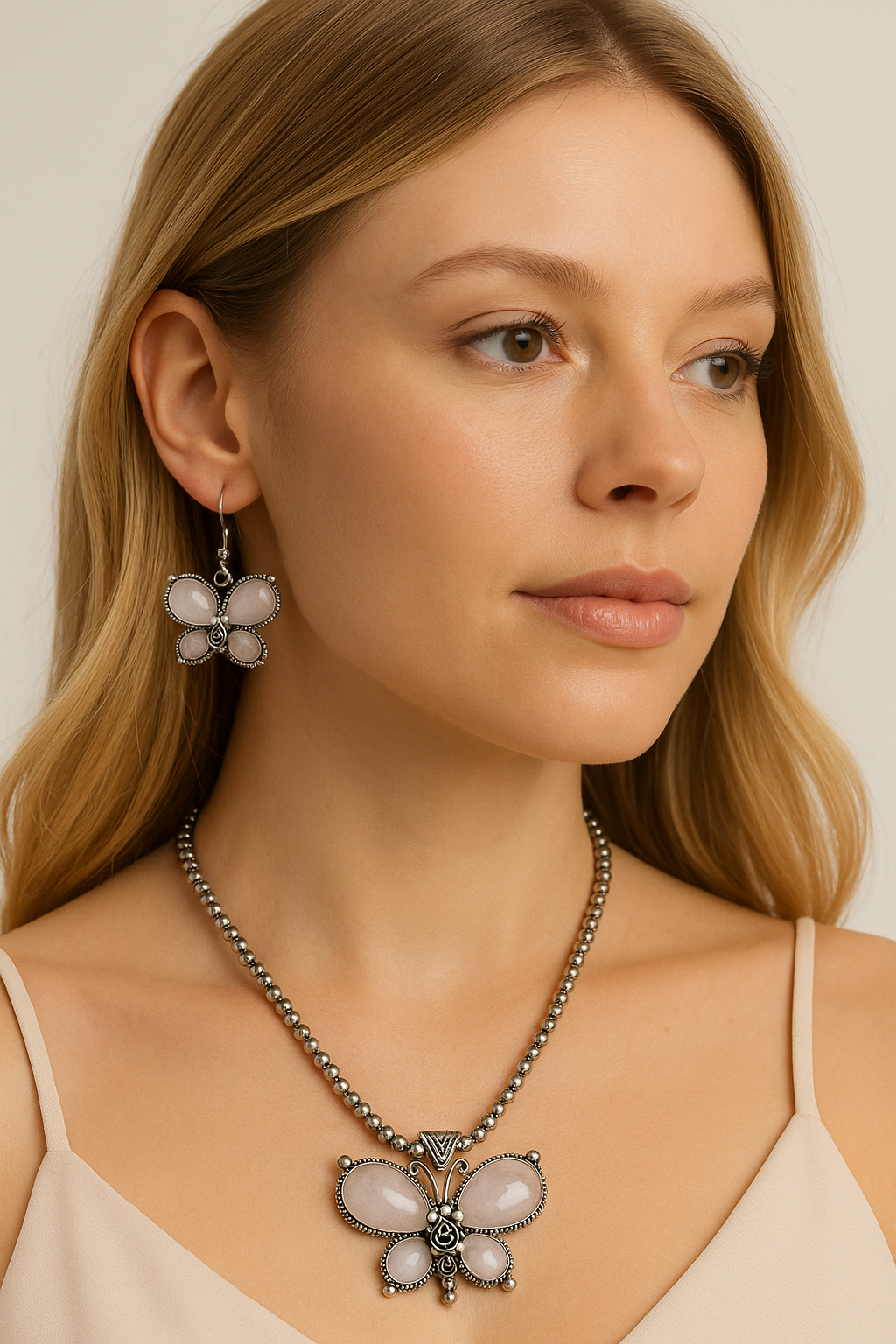 Eleva tu estilo con este delicado juego de collar y aretes en forma de mariposa, elaborado artesanalmente en la India. Cada pieza combina la fuerza y brillo del metal en acero con la suavidad energética del cuarzo rosa, una piedra natural reconocida por atraer armonía, amor propio y bienestar.