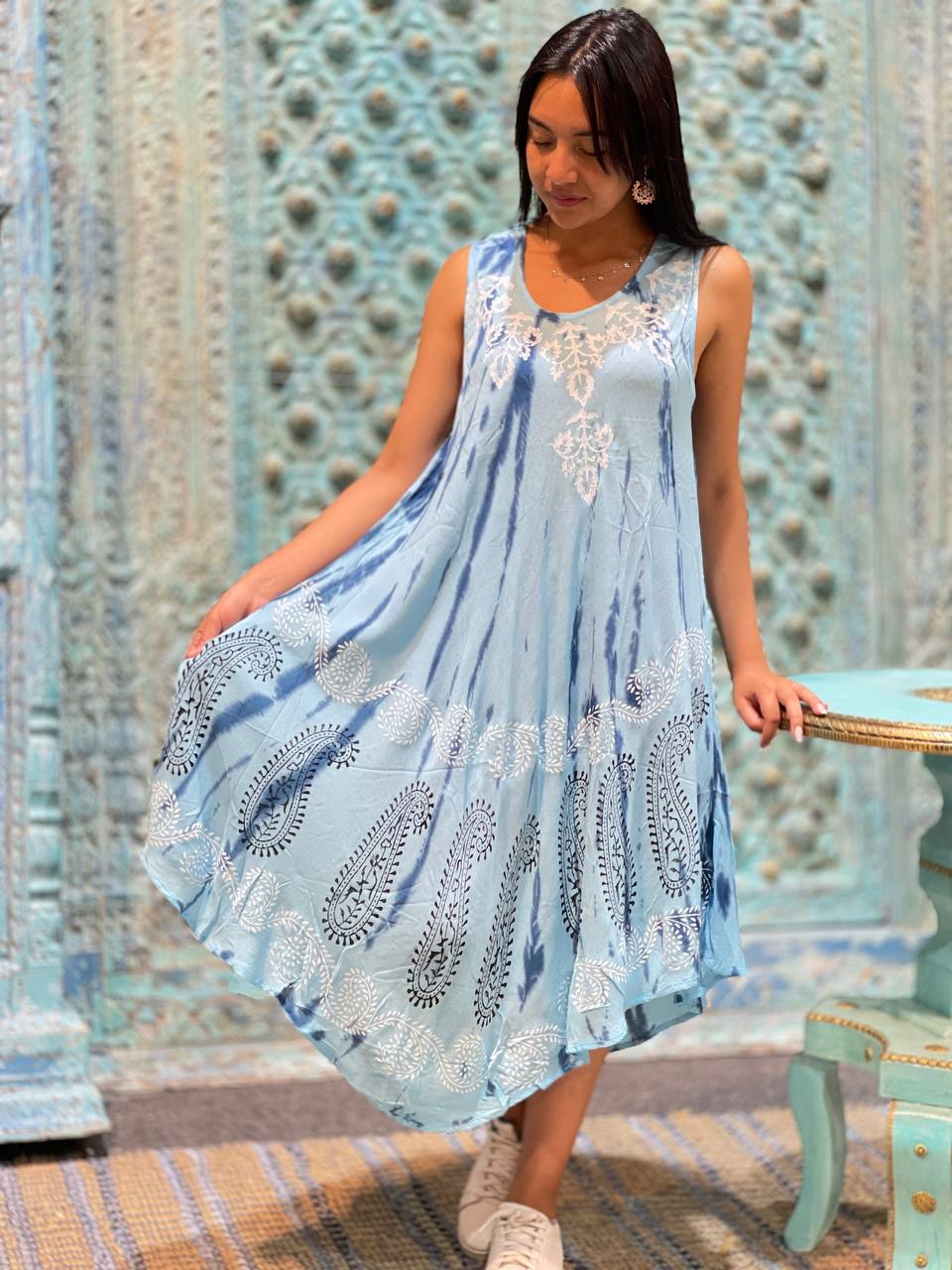 Este vestido de dama, confeccionado en suave 100% viscosa, es una obra de arte con su diseño en blockprint. El corte de cuello en U y las mangas sisa con tiras añaden un toque de estilo único. Además, es práctico gracias a los bolsillos en cada lado. Un vestido que combina comodidad y elegancia a la perfección.